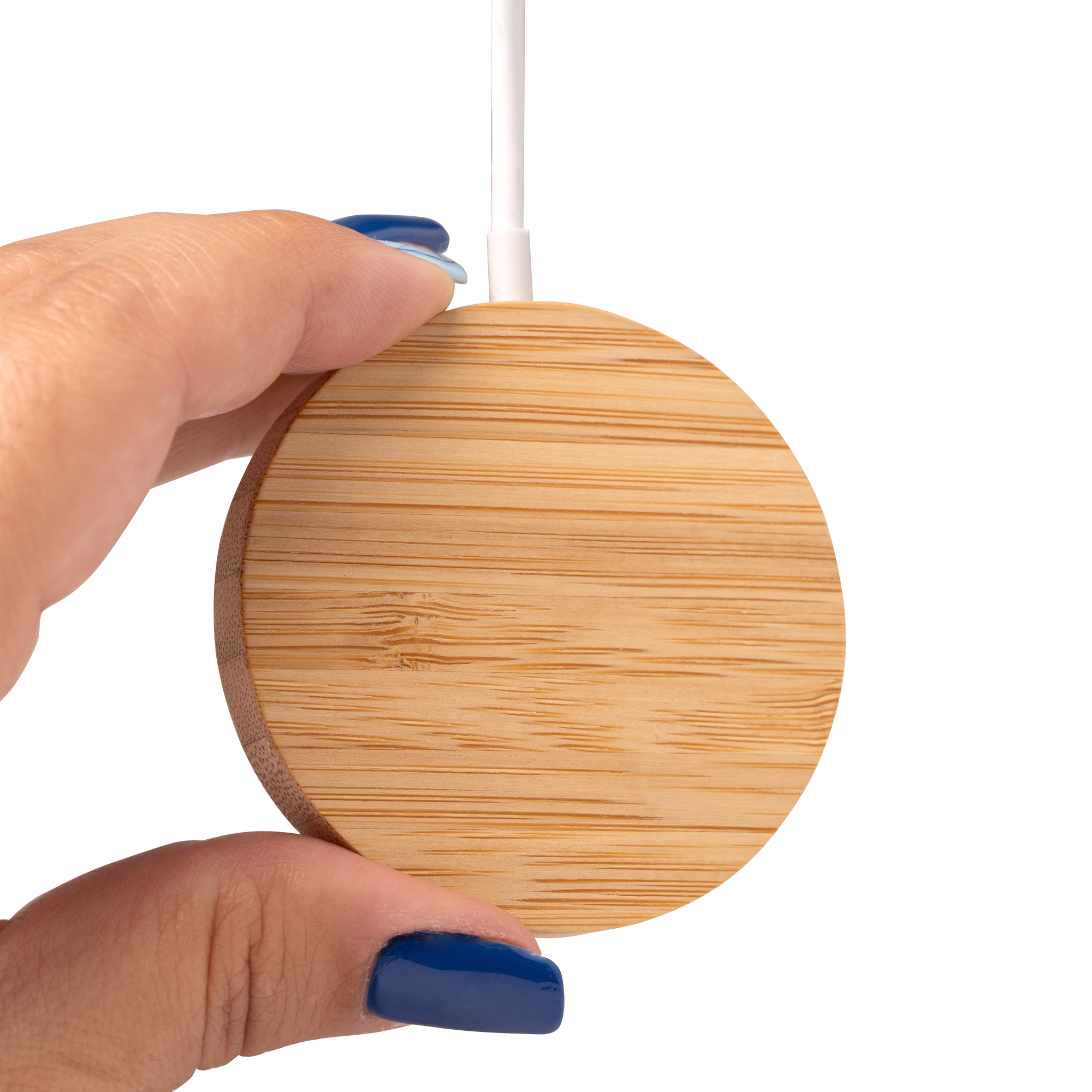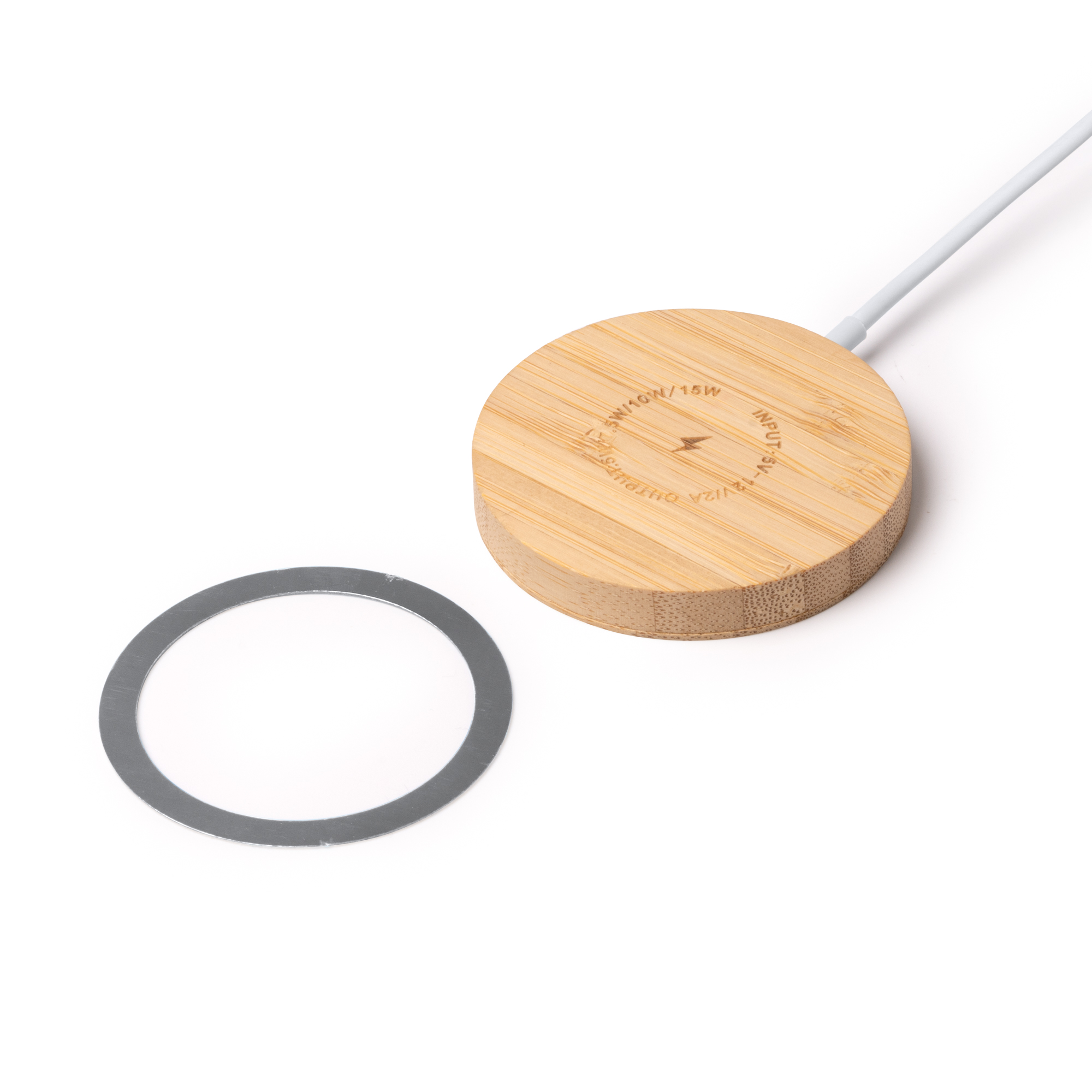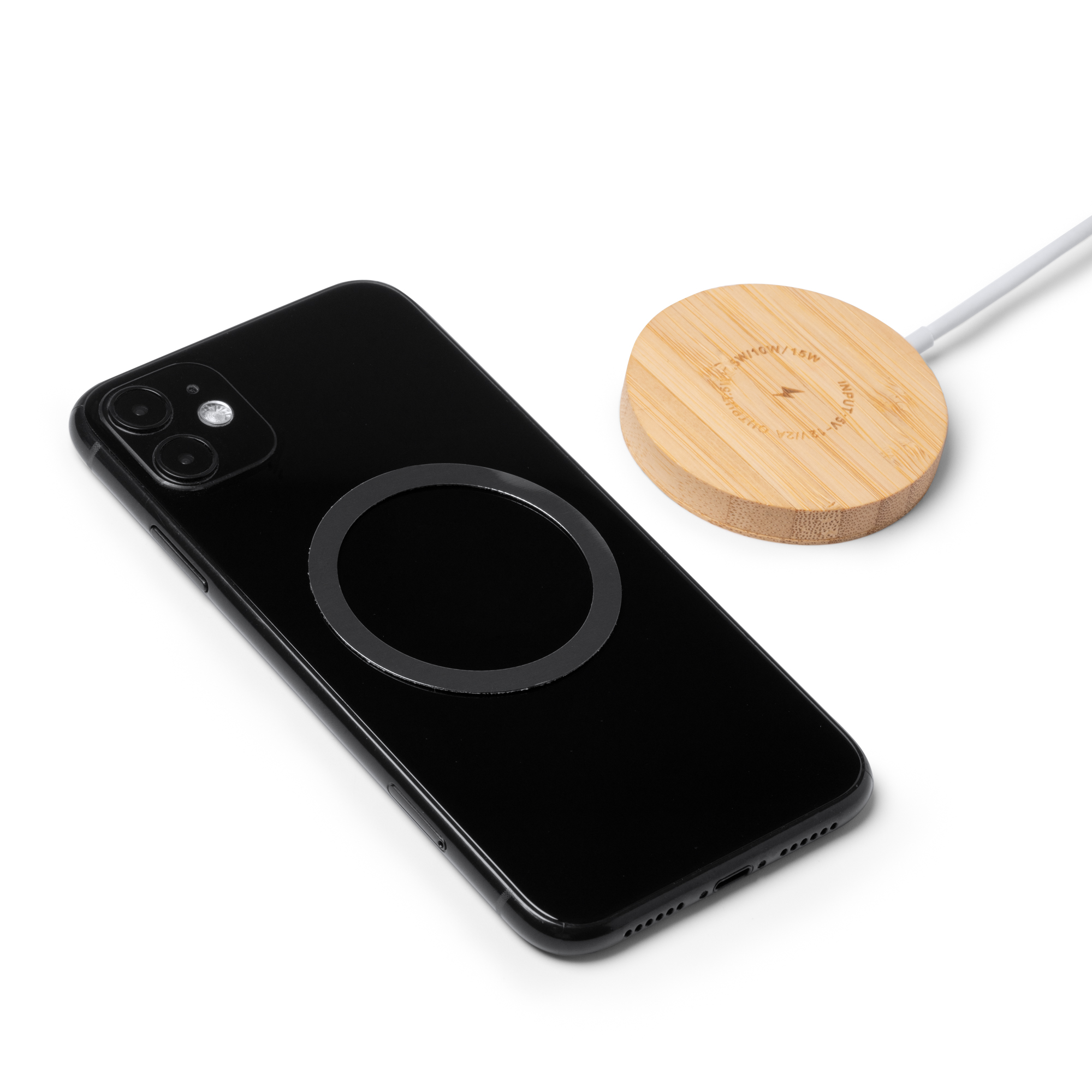 Chargeur sans fil avec structure principale en bambou et fonction magnétique. Charge de 15 W. Entrée de type C. Accessoire de bague adhésive inclus.